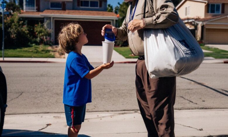 “Here, Mr. Mailman!” he said, holding the cup out with both hands. “You look really thirsty.”