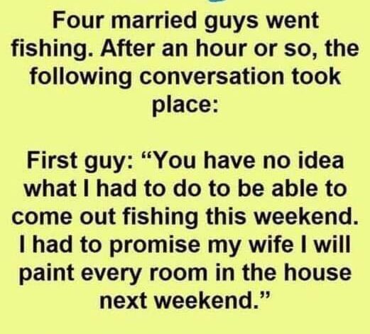 Four married men decided they’d earned a day off from responsibility. After weeks of honey-do lists, work deadlines, and late-night chores, they planned a fishing trip — no phones, no interruptions, just peace, beer, and the illusion of freedom. They met before sunrise, the world still quiet, the lake a mirror. As they set up their rods, conversation naturally drifted to how they managed to get permission for the trip.