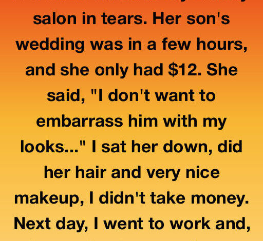“My son’s wedding is in a few hours,” she whispered, her voice shaking. “I don’t want to embarrass him. I only have twelve dollars.”