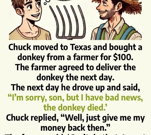 Chuck had barely finished unpacking his boxes when he decided it was time to fully embrace his new Texas life. New state, new start, new attitude—and, apparently, a donkey. He found a local farmer willing to sell him one for a crisp $100. No paperwork drama, no long negotiations. Just a handshake and a promise that the donkey would be delivered the next day. Simple. Honest. Rural efficiency at its finest.