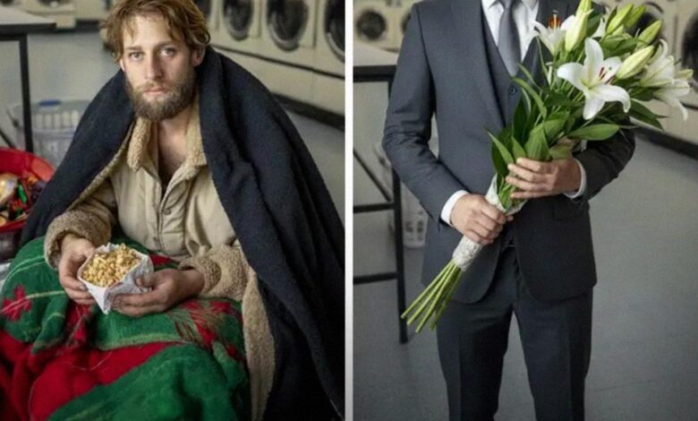 I expected to find the man in the tattered hoodie. Instead, I found a man in a crisp, dark suit standing tall by the dryers, holding a bouquet of white lilies. It was Eli. The transformation was so total I nearly dropped the bag. “You came,” he whispered, his eyes filling with tears.