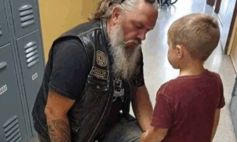 It happened on one of those forgettable afternoons — the kind that blend into the background of life. I was walking into my son’s school courtyard when I saw something that froze me in place: a large, tattooed man in a leather vest kneeling beside my eight-year-old. He was talking to him quietly, pointing at a book open on the ground. My pulse spiked instantly. Every protective instinct in me kicked in. I didn’t stop to think — I just reacted.