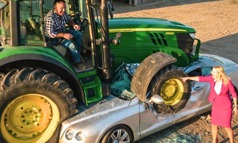 The moment the tractor touched the car everything changed The sound was loud metal bending under pressure glass cracking and snapping like it had no strength at all
