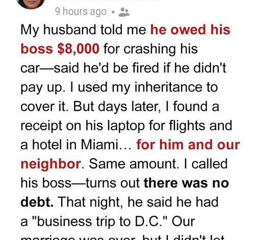 A few months later, he came home late, pale and trembling. “I messed up,” he said, running his hands through his hair. “I crashed my boss’s car. He says I owe him eight thousand dollars or I’m fired.”