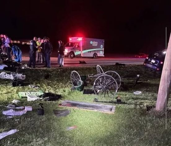 According to the Adams County Sheriff’s Office, the buggy was carrying nine people when it was struck from behind by an eastbound Jeep. The impact was severe enough to throw most of the passengers from the vehicle, leaving the wooden frame splintered across the roadway. Witnesses described a chaotic and heart-wrenching scene — a dark rural stretch suddenly illuminated by flashing emergency lights, sirens echoing through the fields, and medics rushing to stabilize victims as firefighters worked to clear the wreckage.