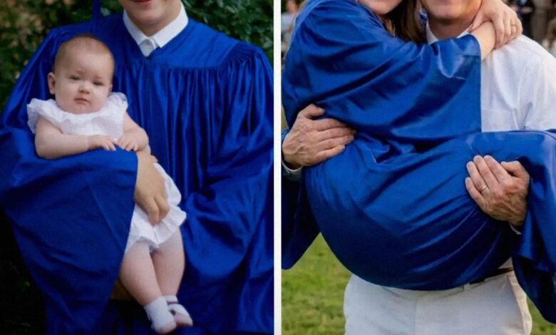 “Okay” was an understatement. He did everything. My dad was only seventeen the night I entered his life. He had returned home from an exhausting shift delivering pizzas to find his old bicycle leaning against the fence. In the front basket, tucked inside a series of blankets, was a three-month-old baby girl. He initially thought someone had left a bag of laundry or trash, but then the bundle moved. Under the folds was a note that would reorder his entire universe: She’s yours. I can’t do this. His mother had passed away, his father was long gone, and his uncle was a man of few words and less affection. He was just a kid with a rusty bike and a part-time job. Most teenagers in that position would have called the police or social services, surrendering the burden to the state. Instead, he wrapped me tighter, adjusted his graduation gown, and walked onto that football field the next morning to receive his diploma with his daughter in his arms. That was the day the picture was taken, and that was the day he chose to never put me down.