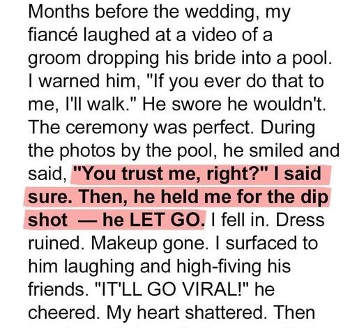 Months before the wedding, Claire and her fiancé, Dylan, had been curled up on the couch, scrolling through funny wedding videos. One clip showed a groom shoving his bride into a swimming pool during their photo session. The crowd in the video laughed. The bride did not. Her shock and humiliation were written all over her drenched face. Claire frowned, uneasy.