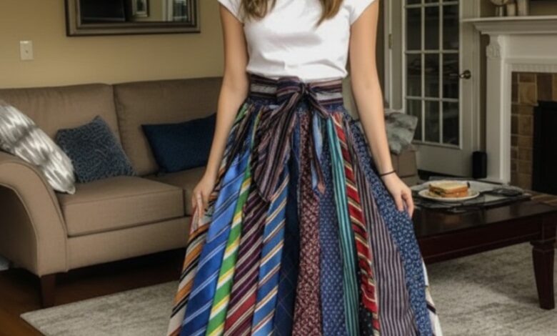 Night after night, I watched tutorials, practiced stitches, and slowly pieced the ties together into a flowing skirt. Every tie held a memory. The paisley one from his big job interview. The navy tie he wore to my middle school recital. The ridiculous guitar-print tie he wore every Christmas morning while baking cinnamon rolls. The skirt wasn’t perfect. The seams wobbled, the hem dipped unevenly, but it felt alive. When I tried it on, I whispered that he would have loved it.