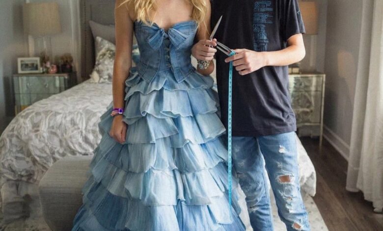 For the next three weeks, the siblings operated like a clandestine resistance cell. They worked only when Carla was out of the house or sequestered in her room. Noah set up their mother’s old sewing machine on the kitchen table, handling the denim with a reverence that felt like a spiritual communion. He deconstructed the jeans, utilizing the various washes, seams, and pockets to create a structured, avant-garde silhouette. The final result was a floor-length gown that transitioned from deep indigo at the bodice to panels of faded sky blue at the hem. It wasn’t a “patchwork mess”; it was a piece of wearable art that held the history of their mother in every stitch.