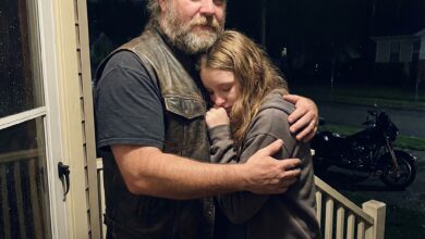 I stood in the darkness of my backyard, my hands trembling as I leveled a shotgun at the massive figure climbing out of my sixteen-year-old daughter’s window. He was the image of every father’s nightmare: leather vest, gray beard, and tattoos snaking down both arms. “Don’t move,” I growled, racking…