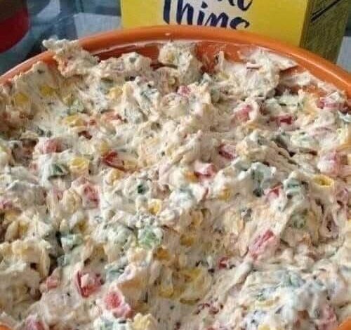 The beauty of this dip is that it blends bright, crunchy vegetables with a silky, cool base made from Greek yogurt and reduced-fat cream cheese. It feels indulgent, but it isn’t. Everything works together: the crisp cucumber, the juicy tomatoes, the mild bite of red onion, the sweet pop of corn, and the fresh herbs that tie it all together. It’s the type of food you can serve beside a pitcher of iced tea or alongside a tray of sparkling drinks, and it never fails to set the tone for a relaxed afternoon.