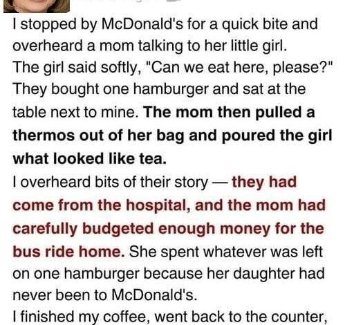 However, as I stood by the counter waiting for my number to be called, my perspective shifted from my own fatigue to a small drama unfolding at a corner table. There sat a mother and her daughter, a pair who seemed out of sync with the fast-food environment. The mother wore a thin coat that had clearly seen better winters, her clothes worn at the seams but meticulously clean. Beside her was a little girl, perhaps six or seven years old, who was trying with all her might to maintain a posture of hope. I had watched them at the register moments earlier. The order was modest—a single small burger and a cup of water—followed by a quiet, hesitant inquiry from the child about a Happy Meal. The mother’s response had been a gentle but firm shake of the head, a “no” that carried the weight of a thousand other denials.