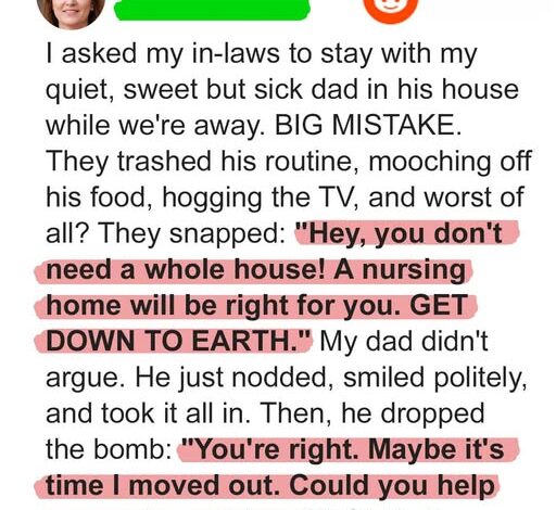 When I asked my in-laws to stay with my father for a week while my husband and I went on a short trip, I thought it would be simple. My dad didn’t need medical care—just company and someone nearby for safety. He’s quiet, gentle, and self-sufficient, the kind of man who enjoys his routines: morning tea by the window, reading in the afternoon, a walk at dusk. I figured my in-laws would keep him company, share some meals, maybe watch a movie or two. I couldn’t have been more wrong.