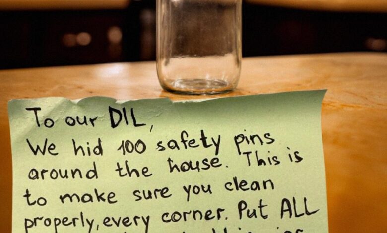 “To our daughter-in-law. We hid 100 safety pins around the house. This is to make sure you clean properly—every corner. Return all of them to this jar. Show us how grateful you are for having a roof over your head.”